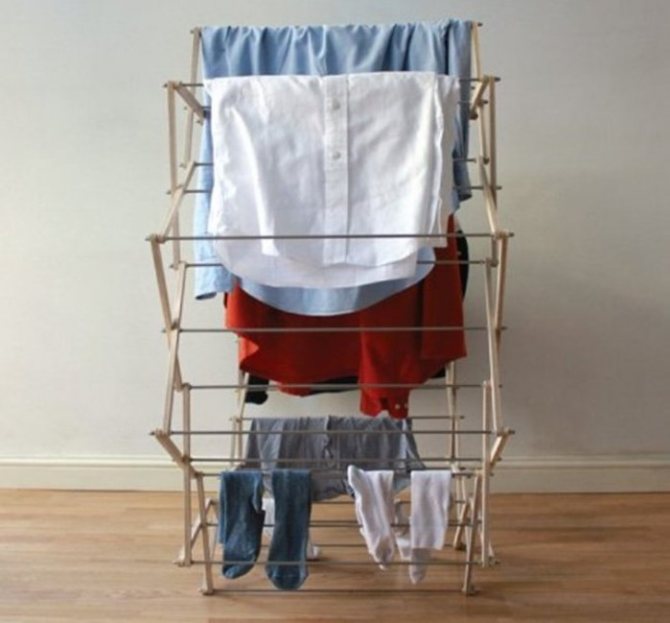 - Напольная сушилка. Компактная и устойчивая, она может быть временно размещена в любом помещении квартиры, а после сушки убрана в гардеробную или коридор.