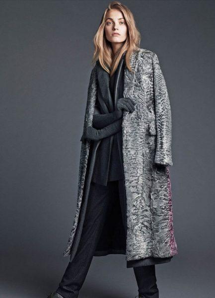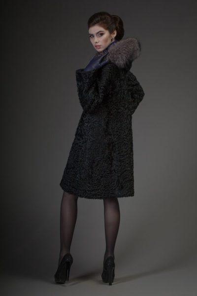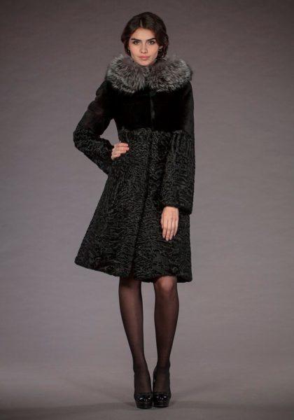 Вторая тенденция актуальная для каракулевых шуб – контрастная цветовая палитра. На фоне традиционного угольно-черного меха шикарно смотрится черно-бурая лисица с нежными переходами тонов. С мехом в коричневой или серой гамме хорошо комбинируется куница или покрашенный песец. В подобном стиле акцентируется внимание на область воротника, капюшона или застежки.