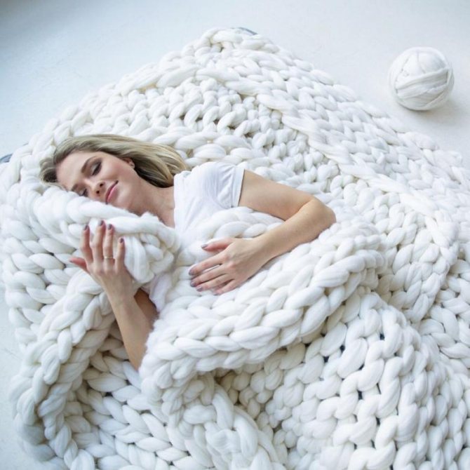 Связать покрывало можно без использования крючков и спиц. Такая техника предполагает активное задействование пальцев рук. Основной смысл такого способа такой же, как и при вязании спицами, крючком.