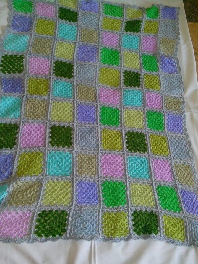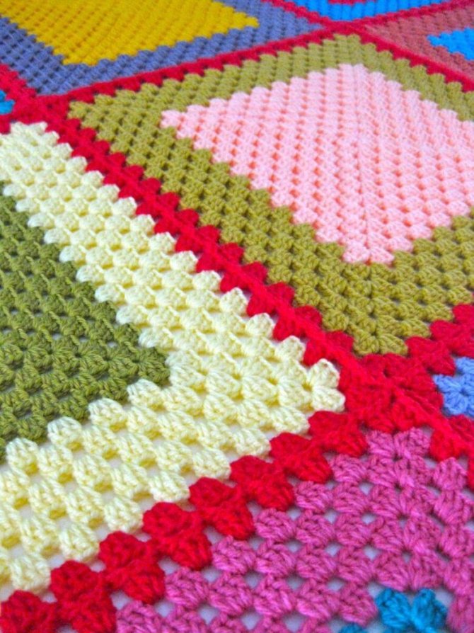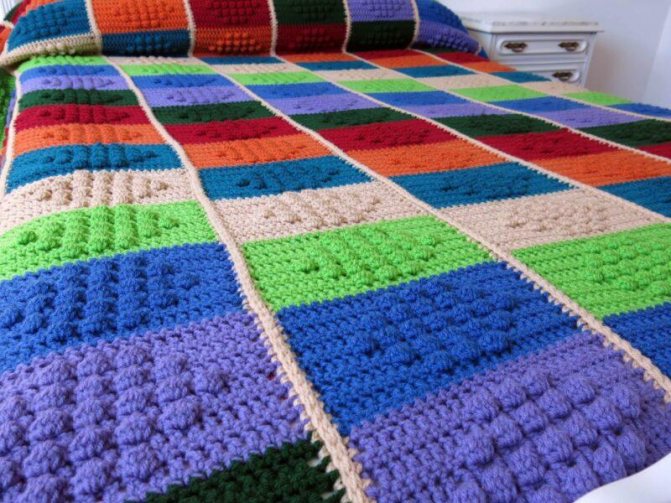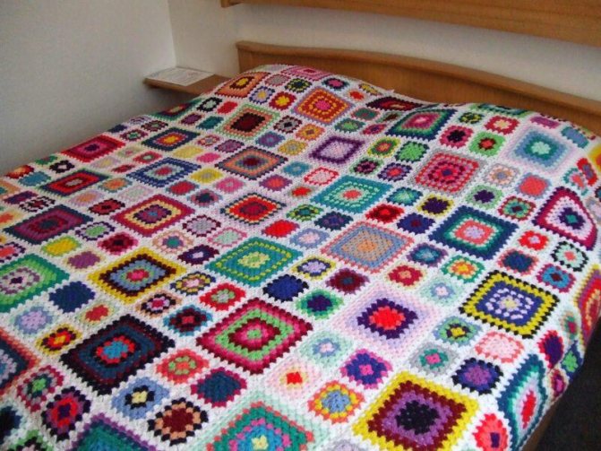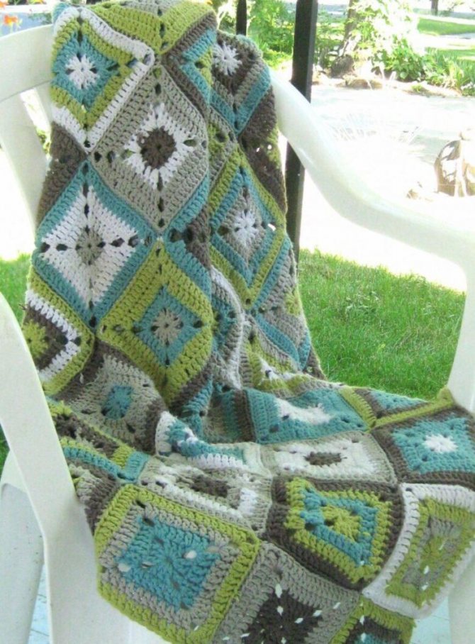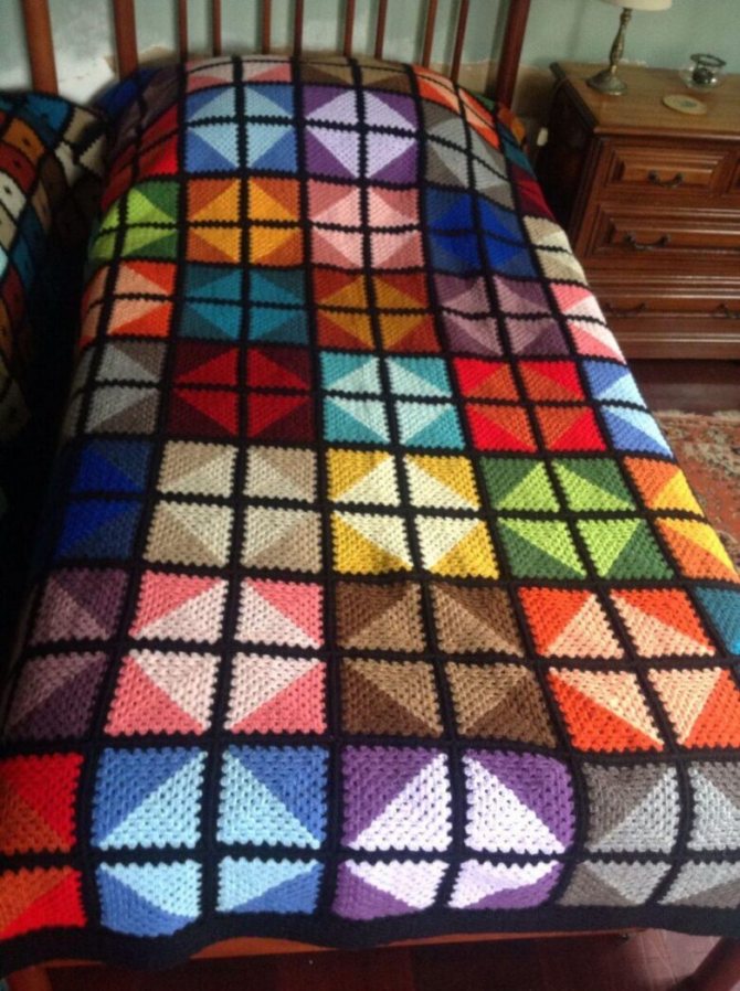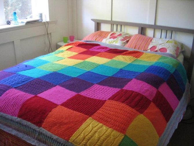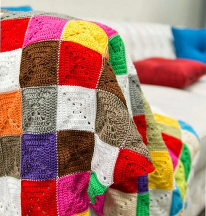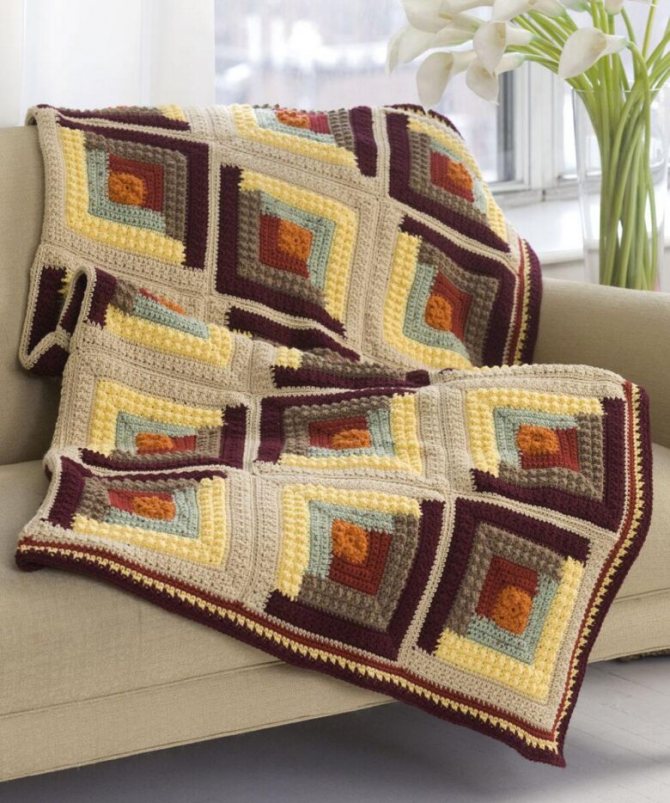 Каждый квадрат выполняется отдельно, затем сшивается в единое полотно. Возможны различные сочетания цветов и узоров. Объединяющим элементов станет обвязка всего пледа.