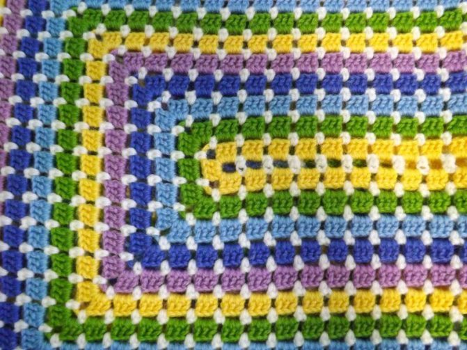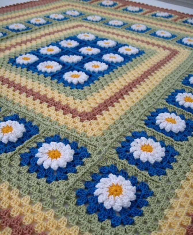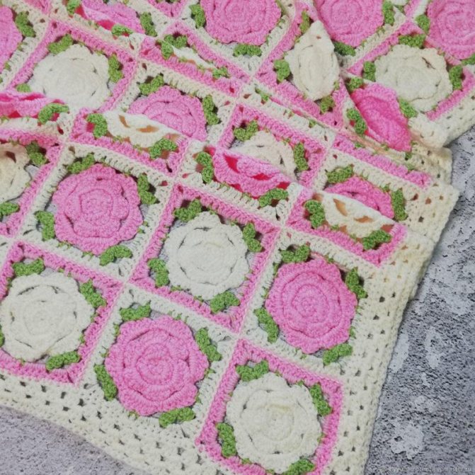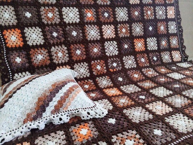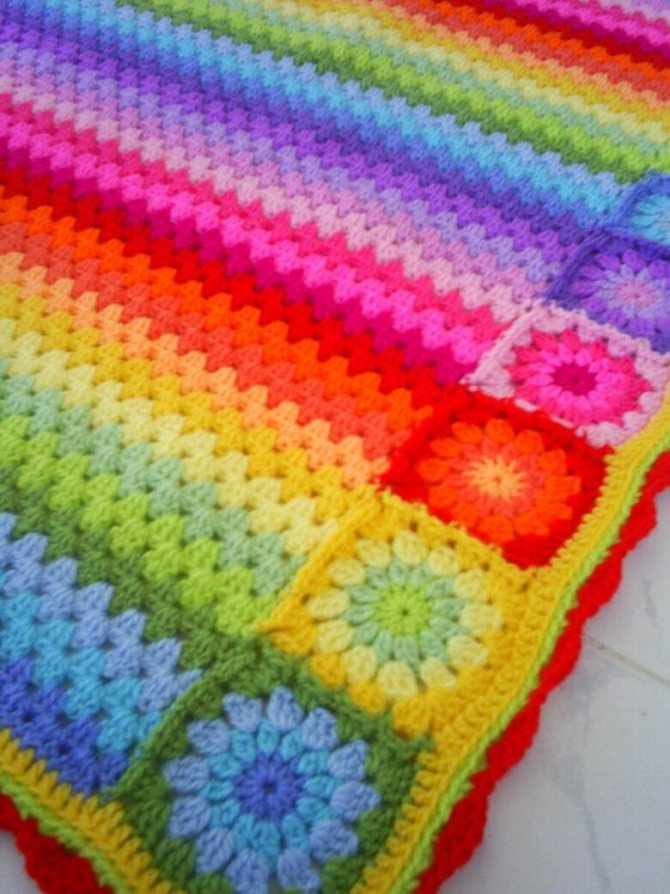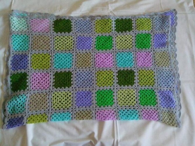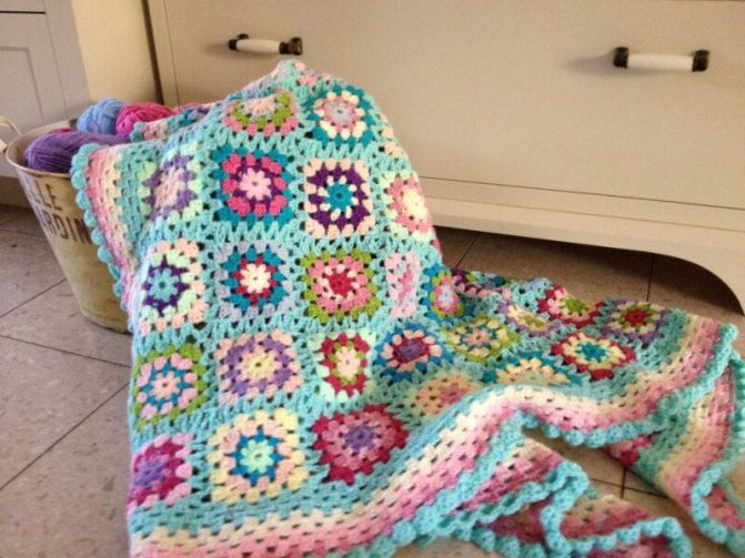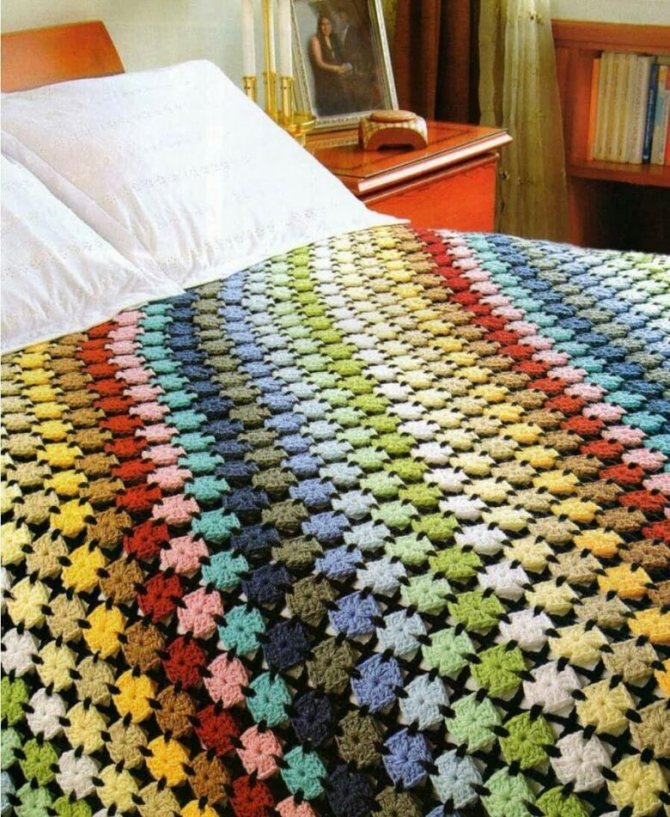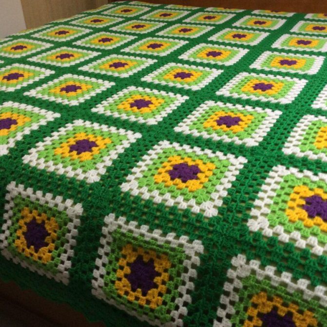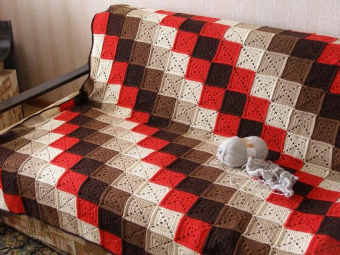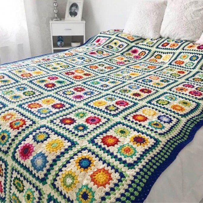 Каждый квадрат выполняется отдельно, затем сшивается в единое полотно. Возможны различные сочетания цветов и узоров. Объединяющим элементов станет обвязка всего пледа.