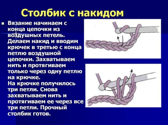 Пятый шаг. Для завершения провязываем три петельки с накидом.