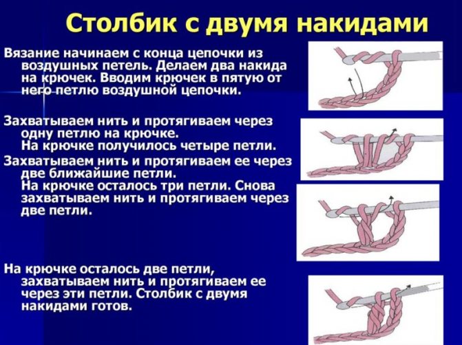 Ознакомимся с подробным описанием вязания пледа. При вязании пледа будем использовать создание воздушных петель, столбиков без накида, столбиков с накидом и соединительных полу столбиков.