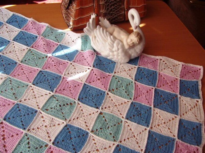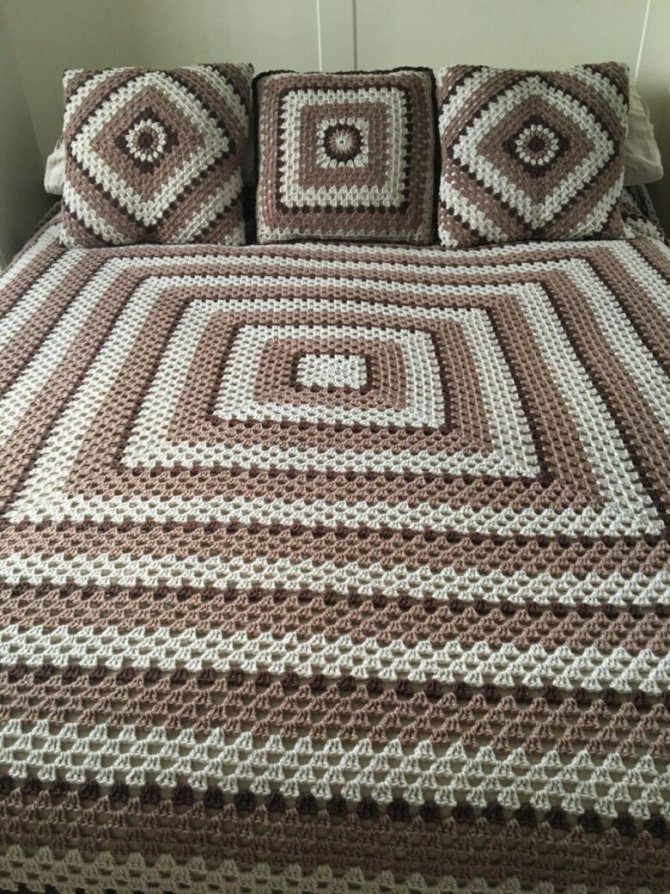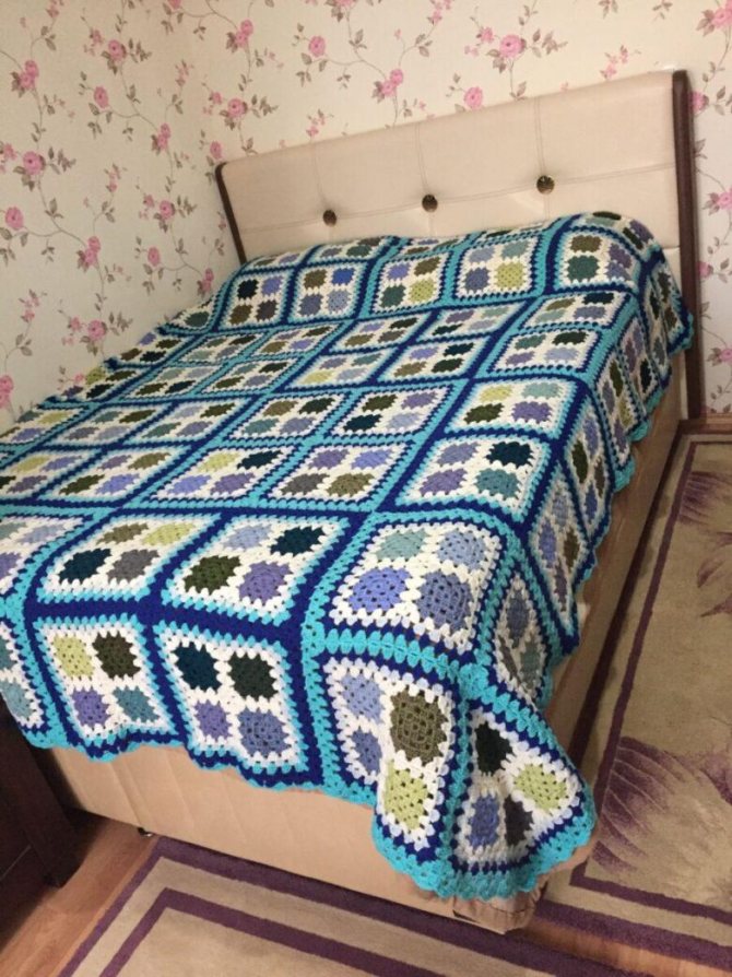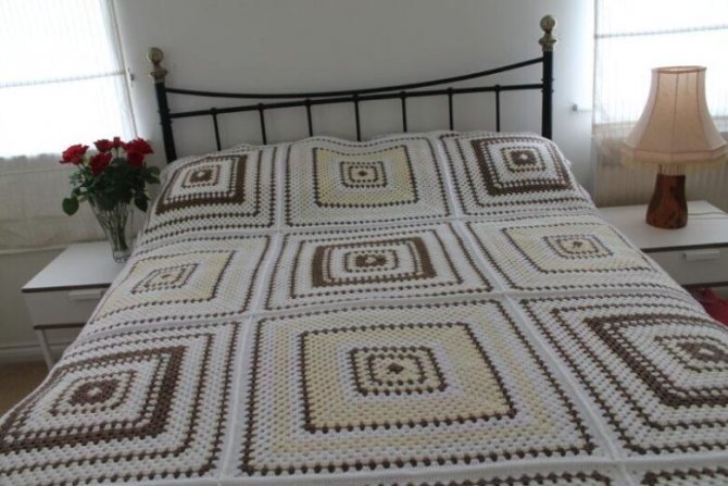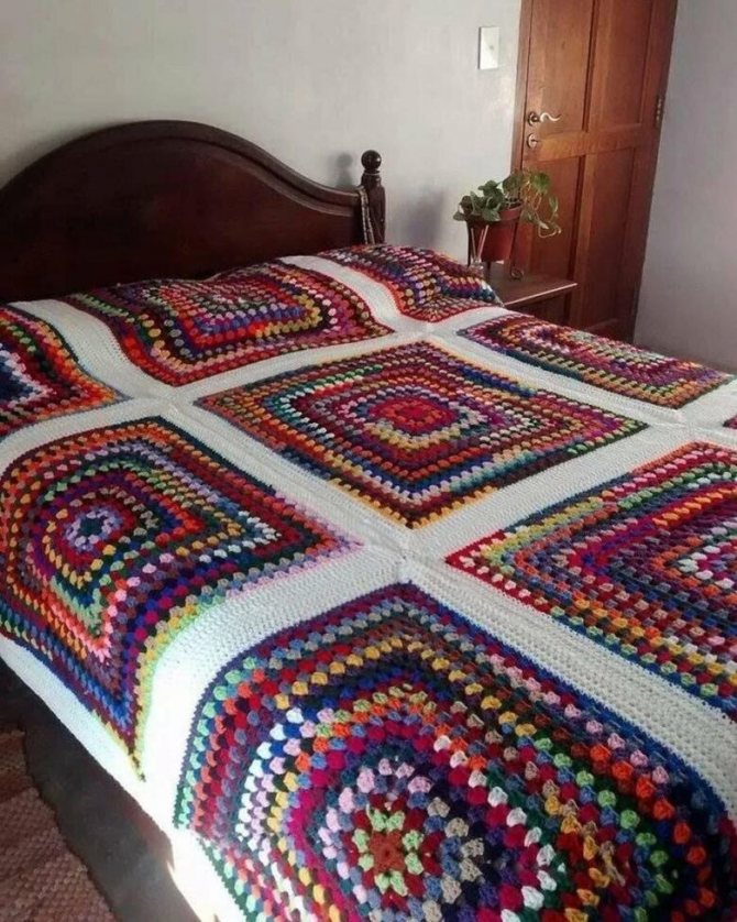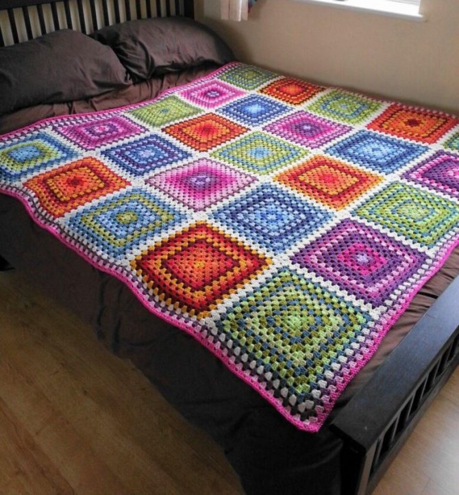 Оригинальный вид имеют изделия, где скомбинированы квадратные фрагменты разных размеров. Стильное покрывало получится из ажурных элементов. Если его постелить на контрастную ткань, в спальне появится яркий акцент. Из одинаковых фигур с помощью цвета можно составить необычные композиции.