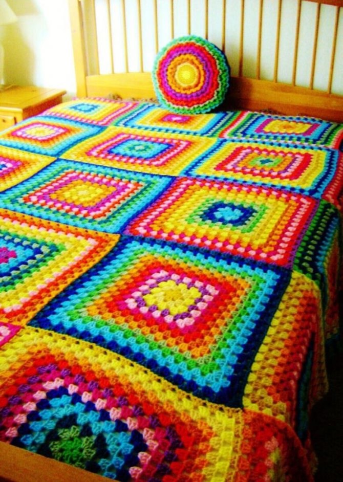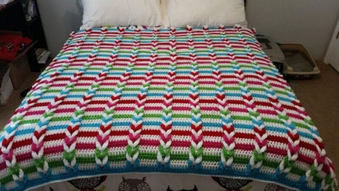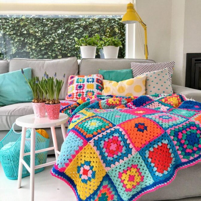Благодаря данной схеме вязания получится шикарный яркий плед, который отлично украсит ваш диван в гостиной.