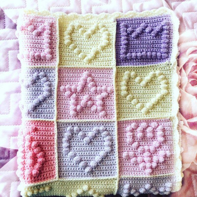 Плед с сердечками: в нем только 12 лицевых дорожек от начала круга и сердечки на них из незаконченных столбиков, связанных вместе.