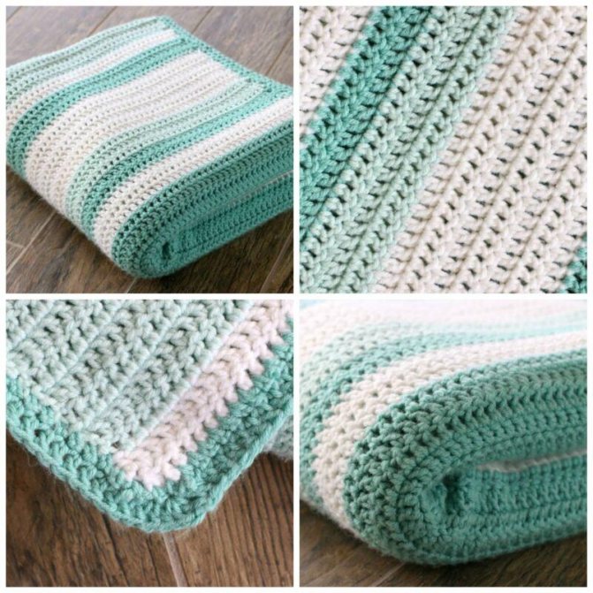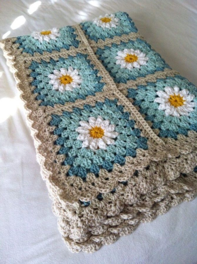 Если плед связан из квадратов, лучший способ обработки края – обвязка. Выполнить ее можно крючком или спицами шириной от 3 до 5 см в зависимости от размеров готового пледа.