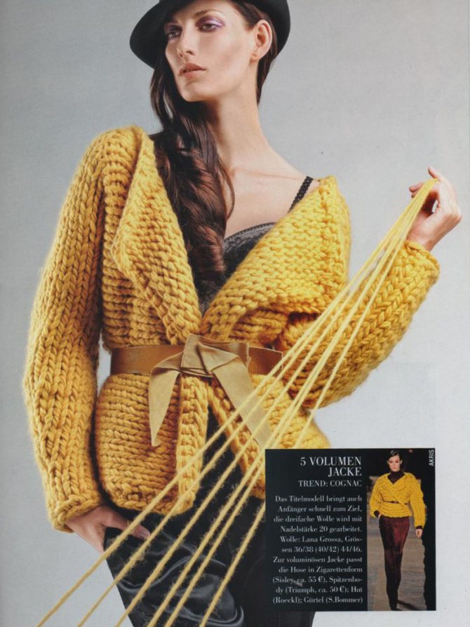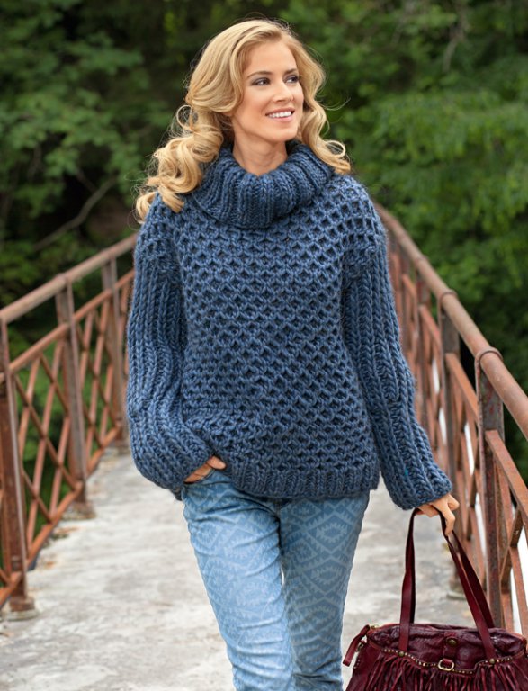 Оригинальные модели с толстой ниткой очень полюбились не только модницам. Из них можно творить разные варианты, укороченные свитера. Использовать интересные и модные геометрические орнаменты. Даже обычная платочная вязка из такой нити выглядит очень необычно и привлекательно. А вот главный секрет, в чём прелесть такого волокна для мастера — это быстрое изготовление. Тот, кто уже имел дело с толстыми нитями уже заметил, всё, что из них выполняется — выполняется моментально.
