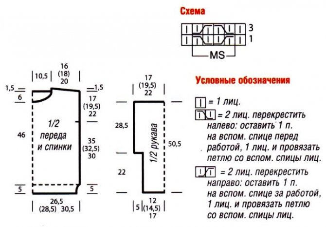 - Из проймы вяжем рукав спицами № 4,5. Набираем на лицевой стороне 62 петли. Жемчужным узором выполняем 18 петель, затем 2 лиц., 6 изн., 2 лиц., 6 изн., 2 лиц., 6 изн., 2 лиц., 18 петель жемчужным узором. Вяжем изнаночный ряд согласно рисунку. Второй ряд делаем 18 петлями жемчужного узора, далее 10 петель по схеме 1, раппорт схемы 1 вяжем дважды, 18 петель жемчужного узора. Получаем 3 косички на рукаве.