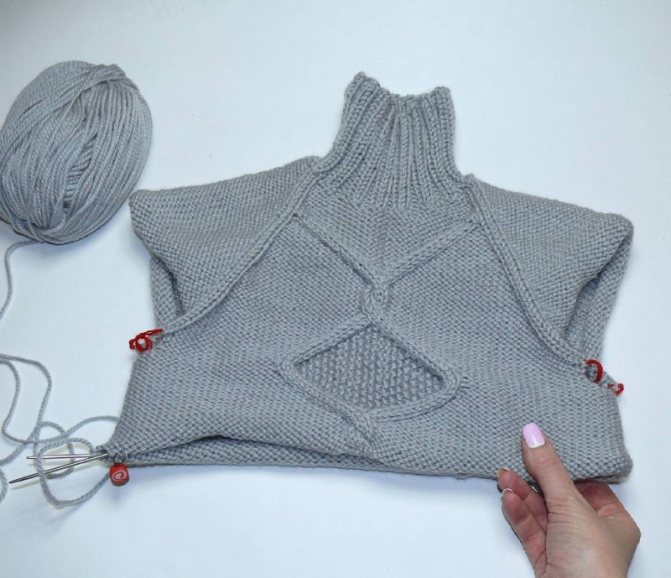 - Приступаем к вороту. Он вяжется резинкой 2×2 высотой 12 см, сразу соединяясь с горловиной спинки.