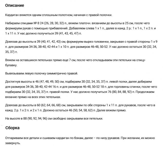 Каждые 5 см делаем убавки с обеих сторон по 1 петле. Когда на спице останется 52 петли, убавления прекращаем. Провязав 31 см полотна для рукава, вяжем манжету спицами № 3,5 резинкой 2×2 шириной 5 см, предварительно убавив в первом ряду 18 петель.
