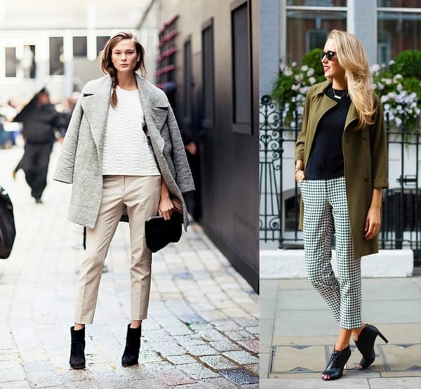 Укороченные брюки необязательно должны обладать широким кроем. Если ваш фаворит – это более прилегающий крой, то от союза с сапогами-гольфами придется отказаться. В таком случае стильной задумкой может стать микс с высокими ботильонами.